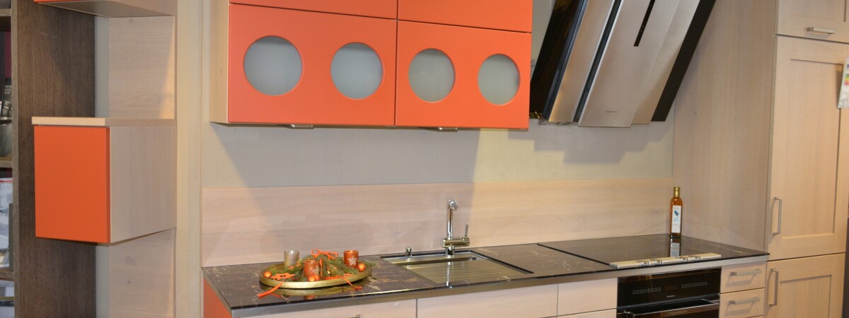 Hier bieten wir Ihnen eine moderne Landhausküche der Firma Schüller in der Frontfarbe Orange/ Ziegelrot und funierte Holzfront in Eiche weiß gekälkt an.
