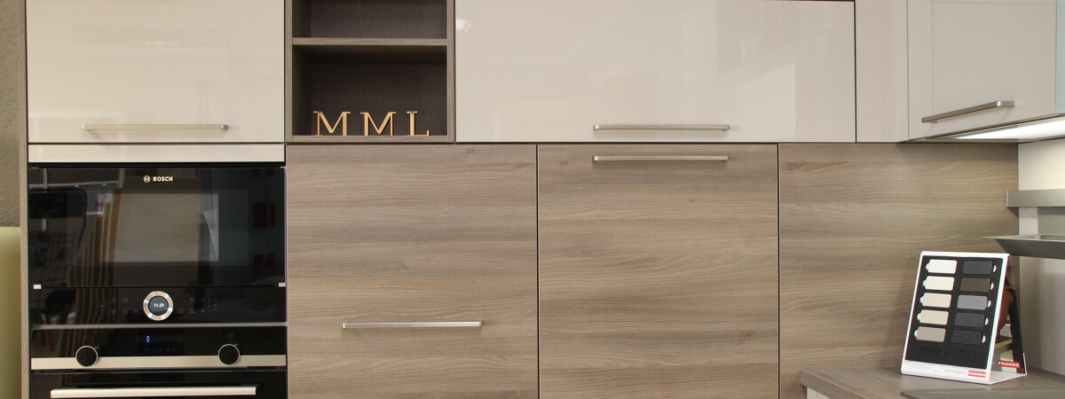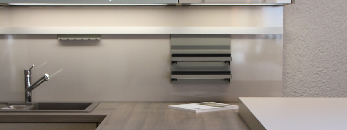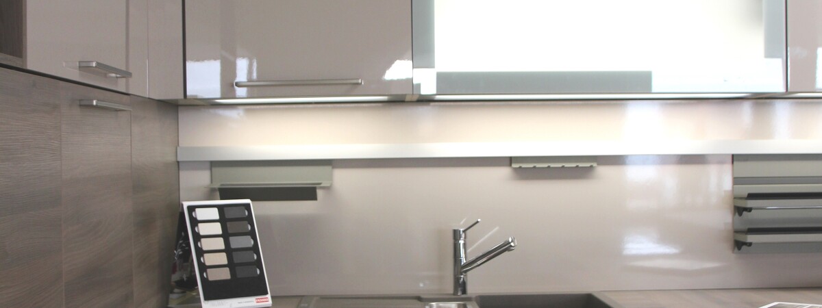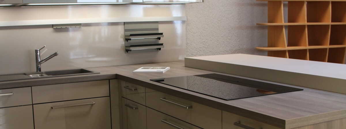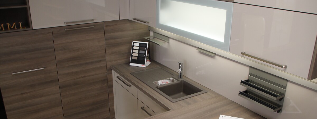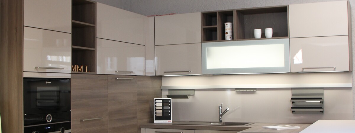 Durch die Farbkombination von Kaschmir-Hochglanz und Akazie-grau Fronten wirkt die Küche elegant und schlicht. Es gibt einige Besonderheiten wie die grifflosen Schränke in der Inselrückseite sowie 2 Oberschrank Lifttüren mit Mattglasfronten. Die Unterschränke sind ausgestattet mit Auszügen, (LeMans-)Auszug im Eckschrank, Abfallsystem im Spülenschrank und Antirutschmatten in den Schubkästen. Die matten Edelstahl Bügelgriffe fügen sich optisch in die Küche ein und haben eine angenehme Haptik.