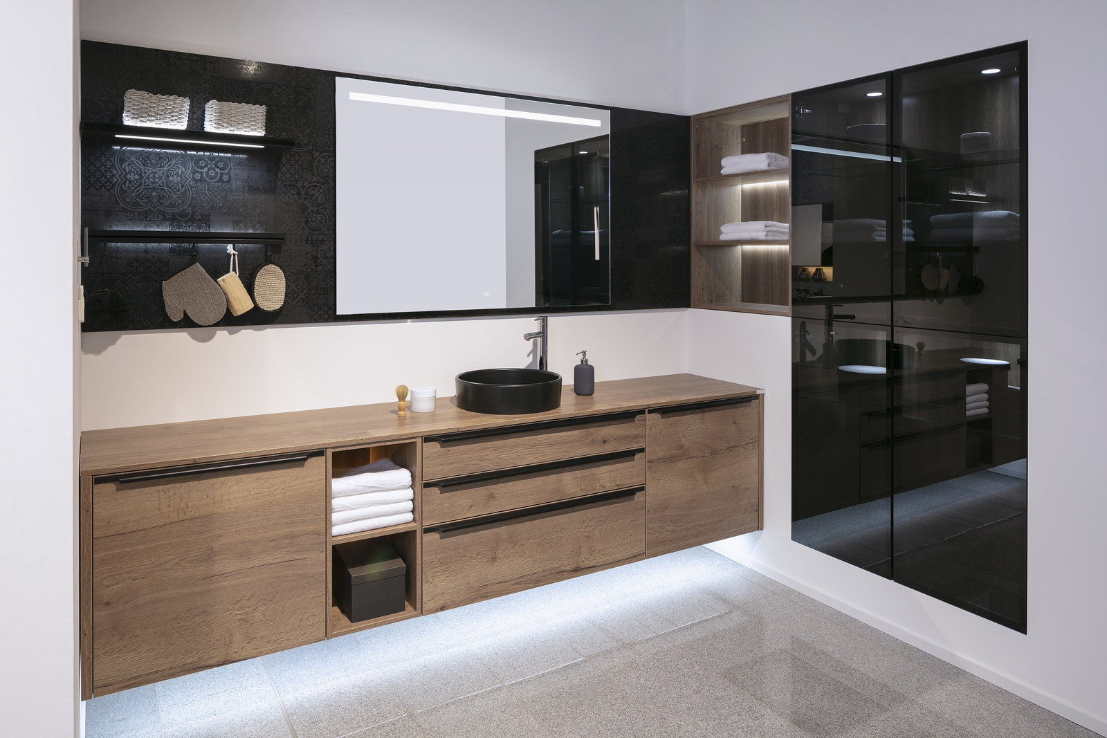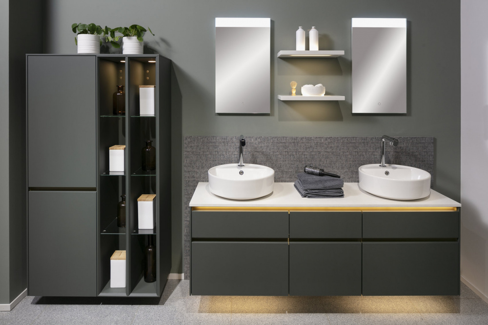 Umgekehrt macht sich der allumfassende Küchentrend hin zu immer wohnlicheren Küchen auch beim Badezimmer bemerkbar. Denn auch Bäder wünscht man sich inzwischen aufenthaltsfreundlicher, individueller und ganzheitlicher gedacht. Und das entspricht dem Obertrend, das eigene Zuhause als Wohlfühl-Ort mit kleinen Wellness-Oasen zu gestalten. So dominieren auch bei den gezeigten Badeinrichtungstrends natürliche Farbtöne wie Sand, Taupe, Graphit oder Eiche, häufig kombiniert mit matten Oberflächen oder textilen Strukturen.