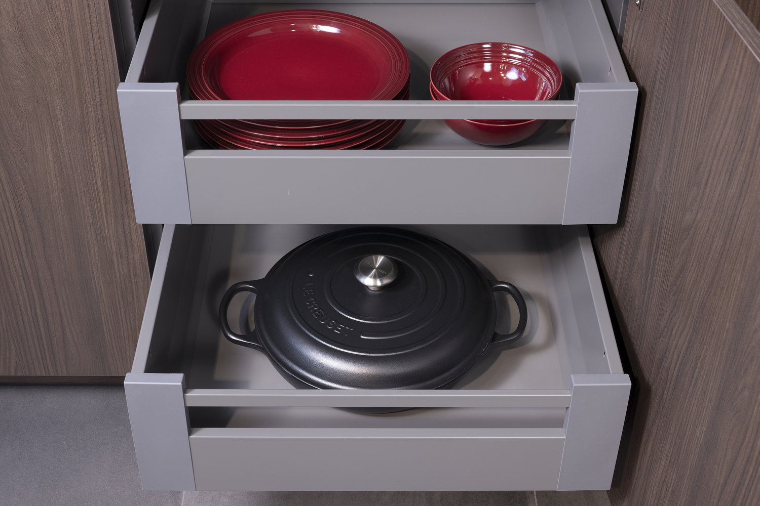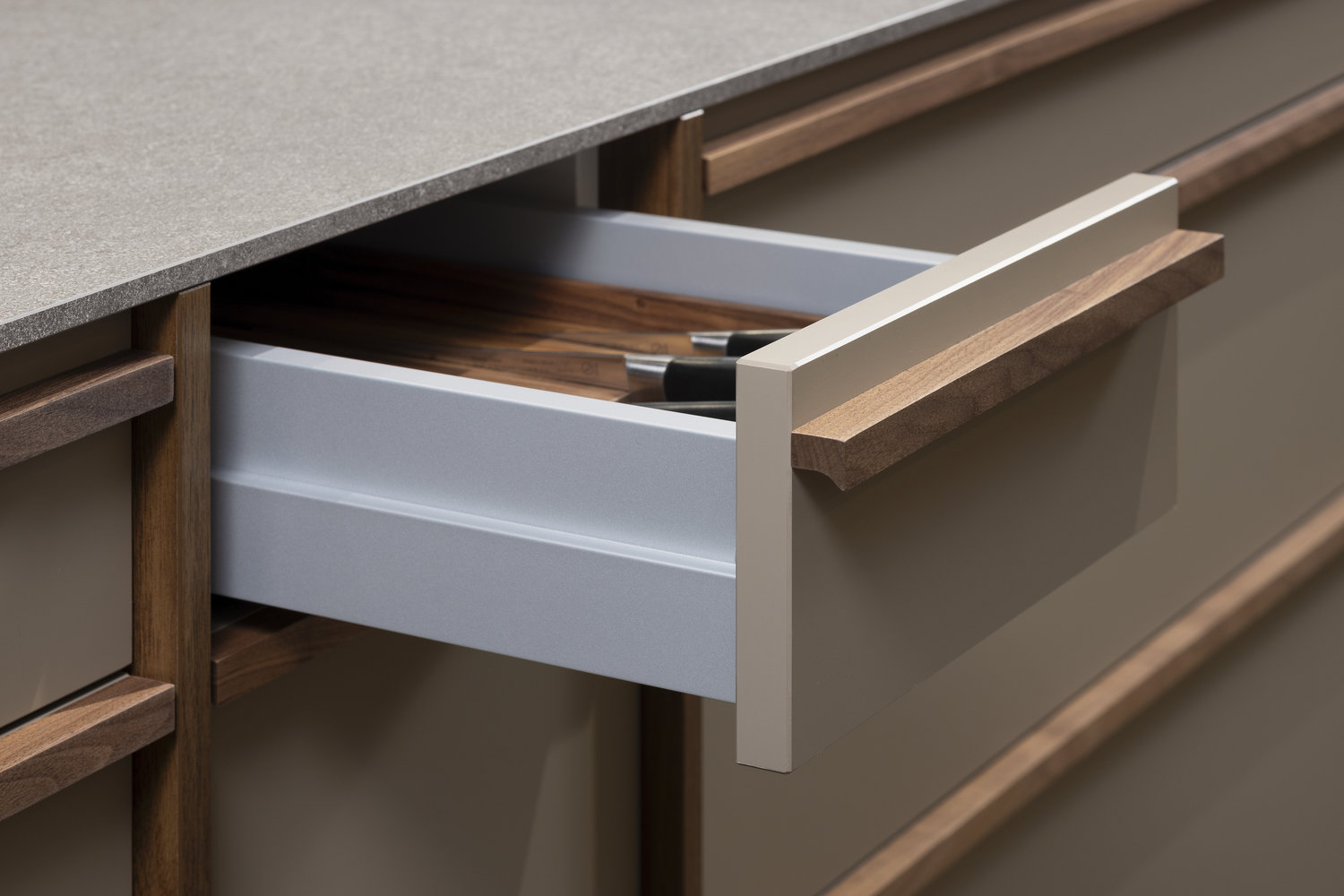 In rechteckiger Ausführung lässt sich der eingelassene Muldengriff auch bündig mit der Oberkante des Auszugs positionieren, hier noch von einer schwarzen Zierleiste unterstrichen: