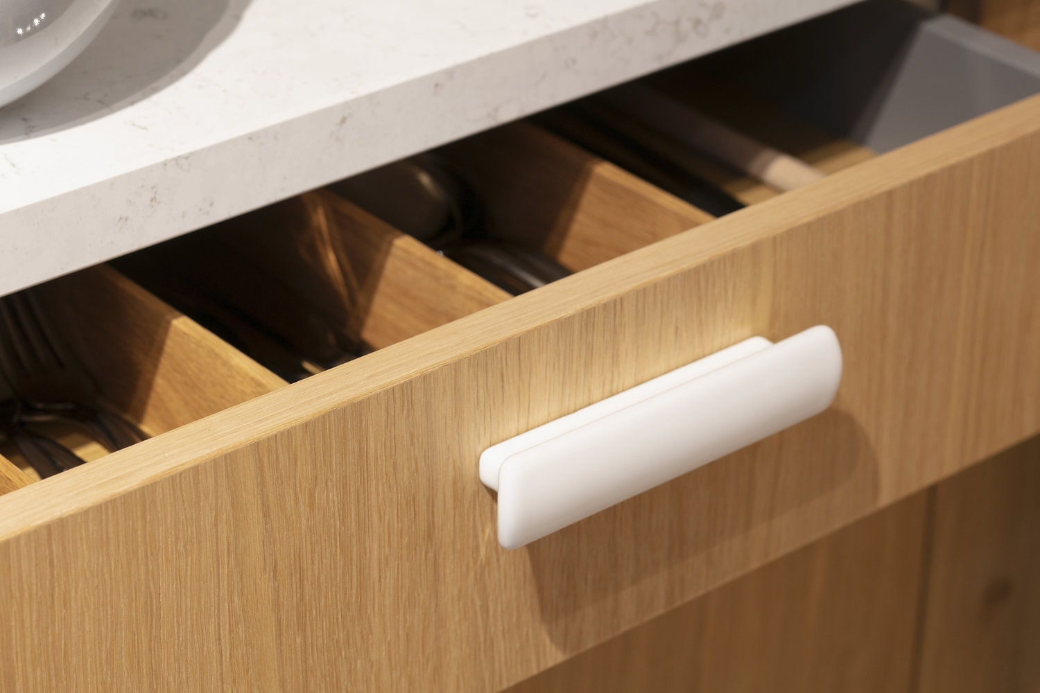 Unten ein weißer Möbelgriff, der die Knauf-Handhabung und den Bügelgriff auf einen Nenner bringt: