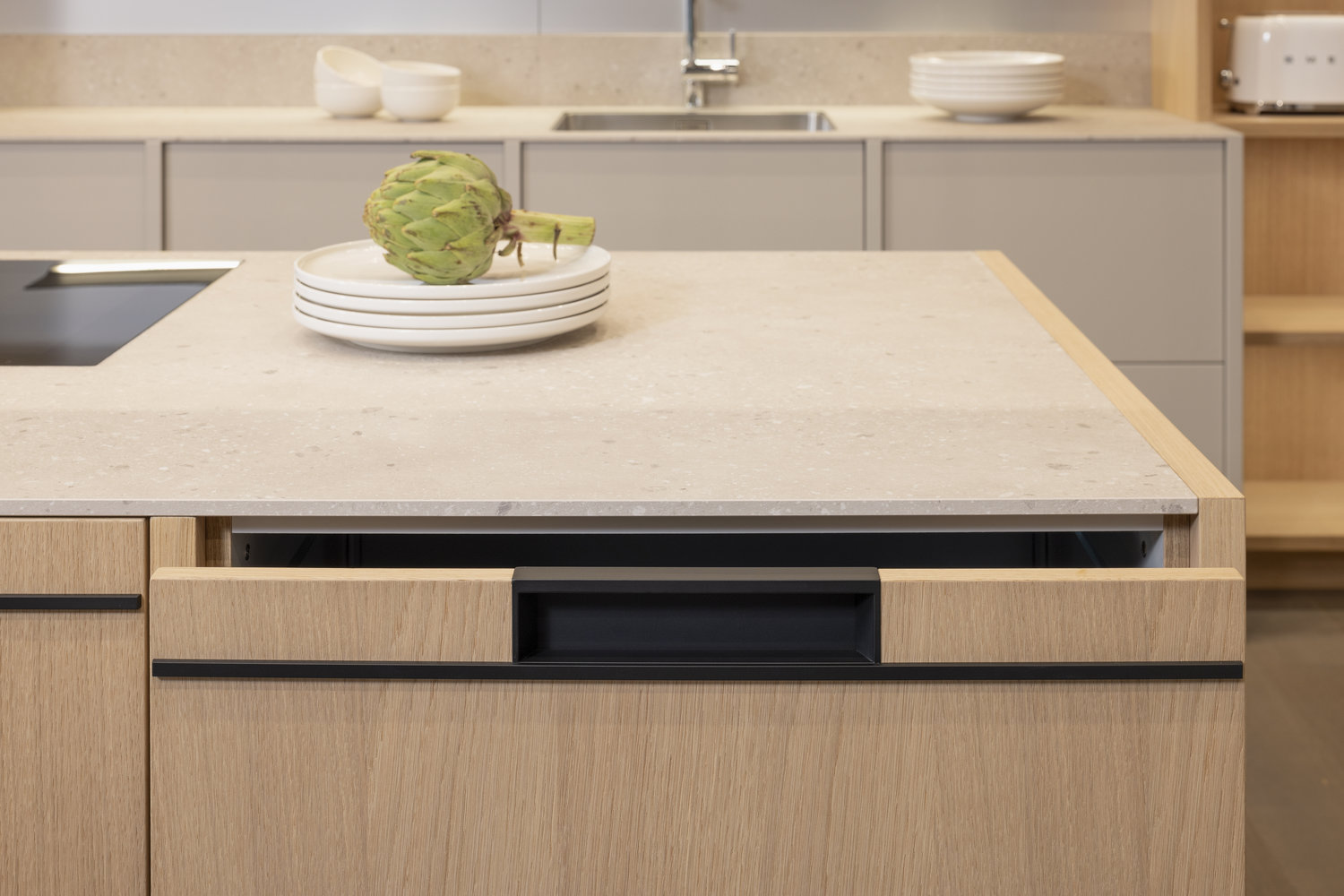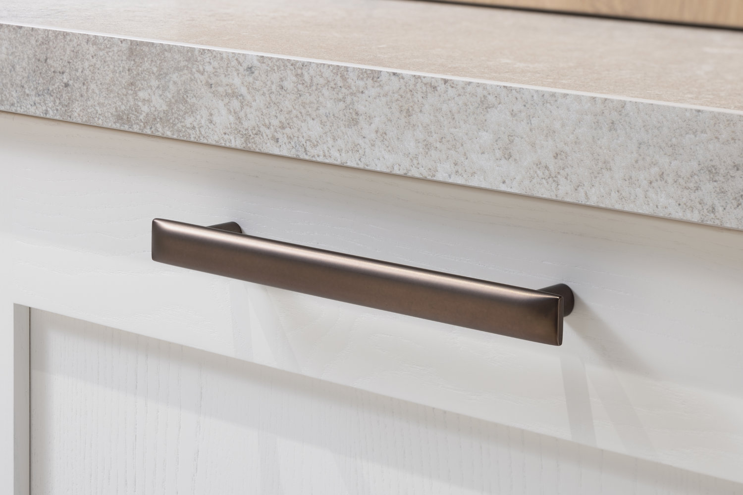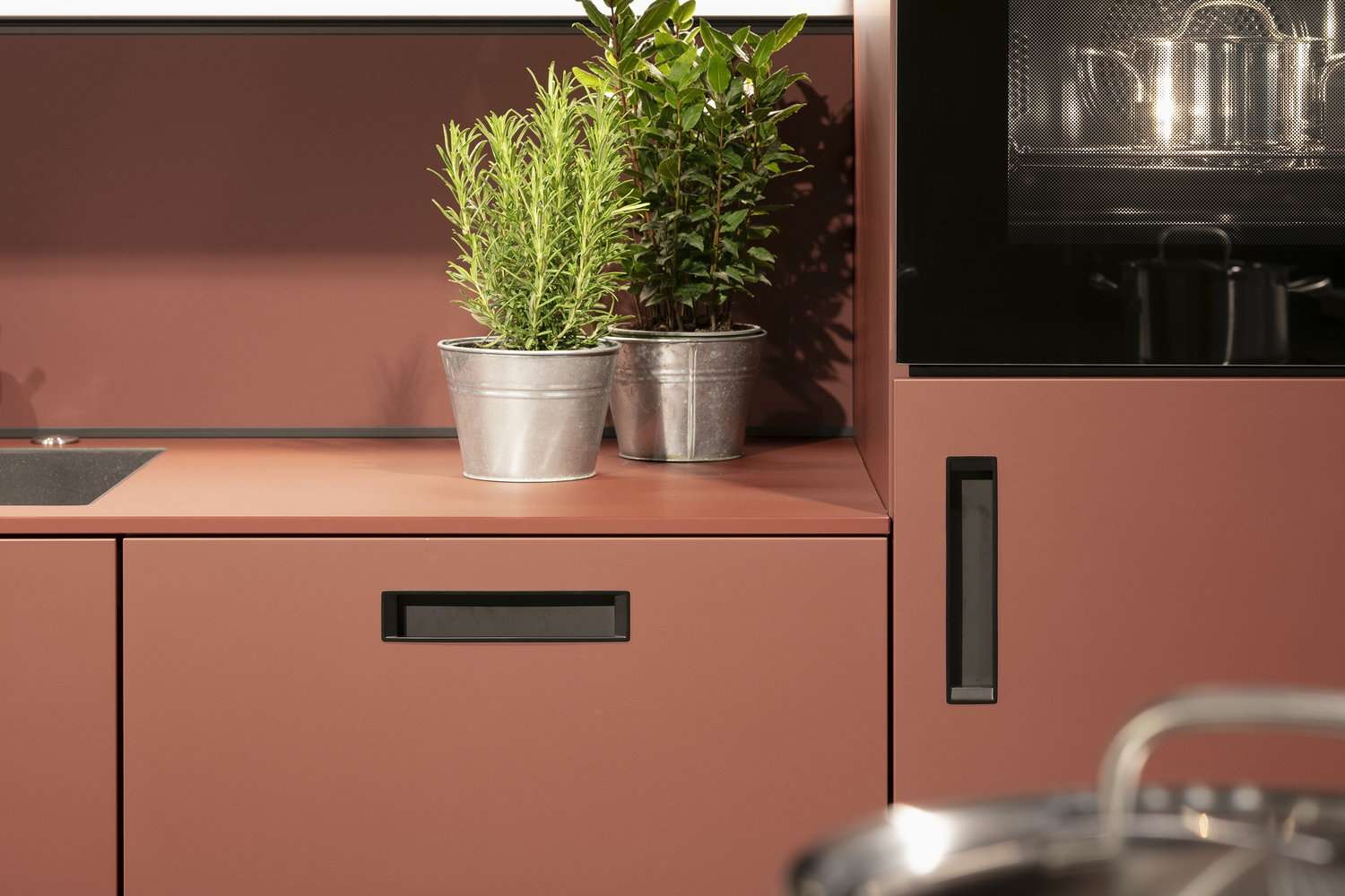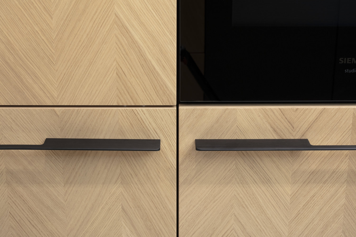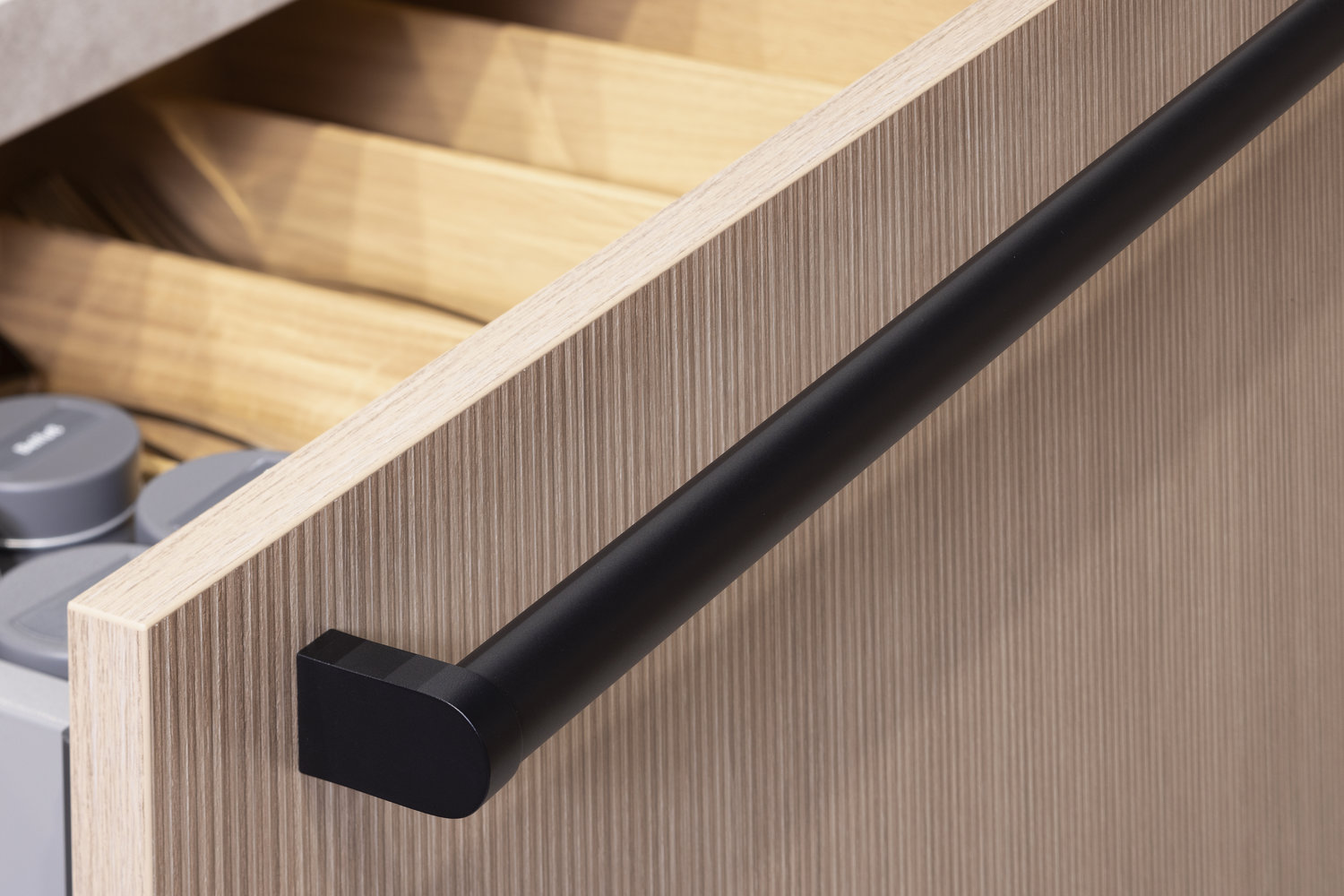Der nachfolgende Metallgriff wird von unten erfasst und ist die perfekte minimalistische Ergänzung für ausdrucksstarke Küchenfronten, egal, ob es sich um Rillenfronten oder stark gemusterte Fronten handelt: