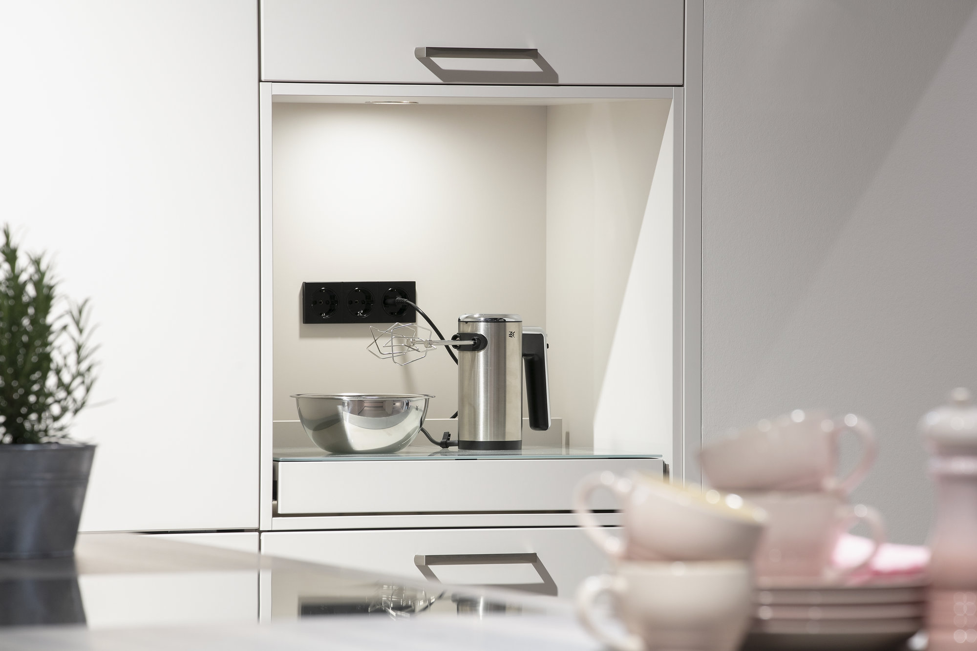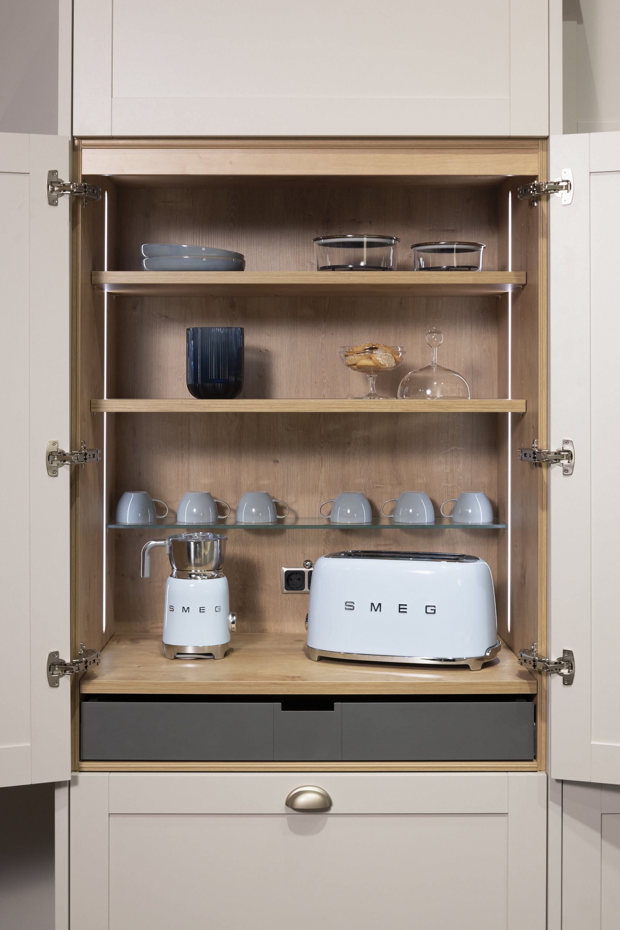 Gerade bei Küchenmaschinen mit umfangreichem Zubehör – Rührschüsseln, Aufsätze, Raspelscheiben, Spritzgebäckvorsätze – summiert sich die Menge an Einzelteilen schnell. Die eleganteste Lösung besteht darin, all diese Utensilien an einem einzigen, dafür vorgesehenen Ort unterzubringen. Ein speziell konzipierter Küchenschrank schafft hier Abhilfe und sorgt dafür, dass Sie innerhalb weniger Sekunden startklar sind: